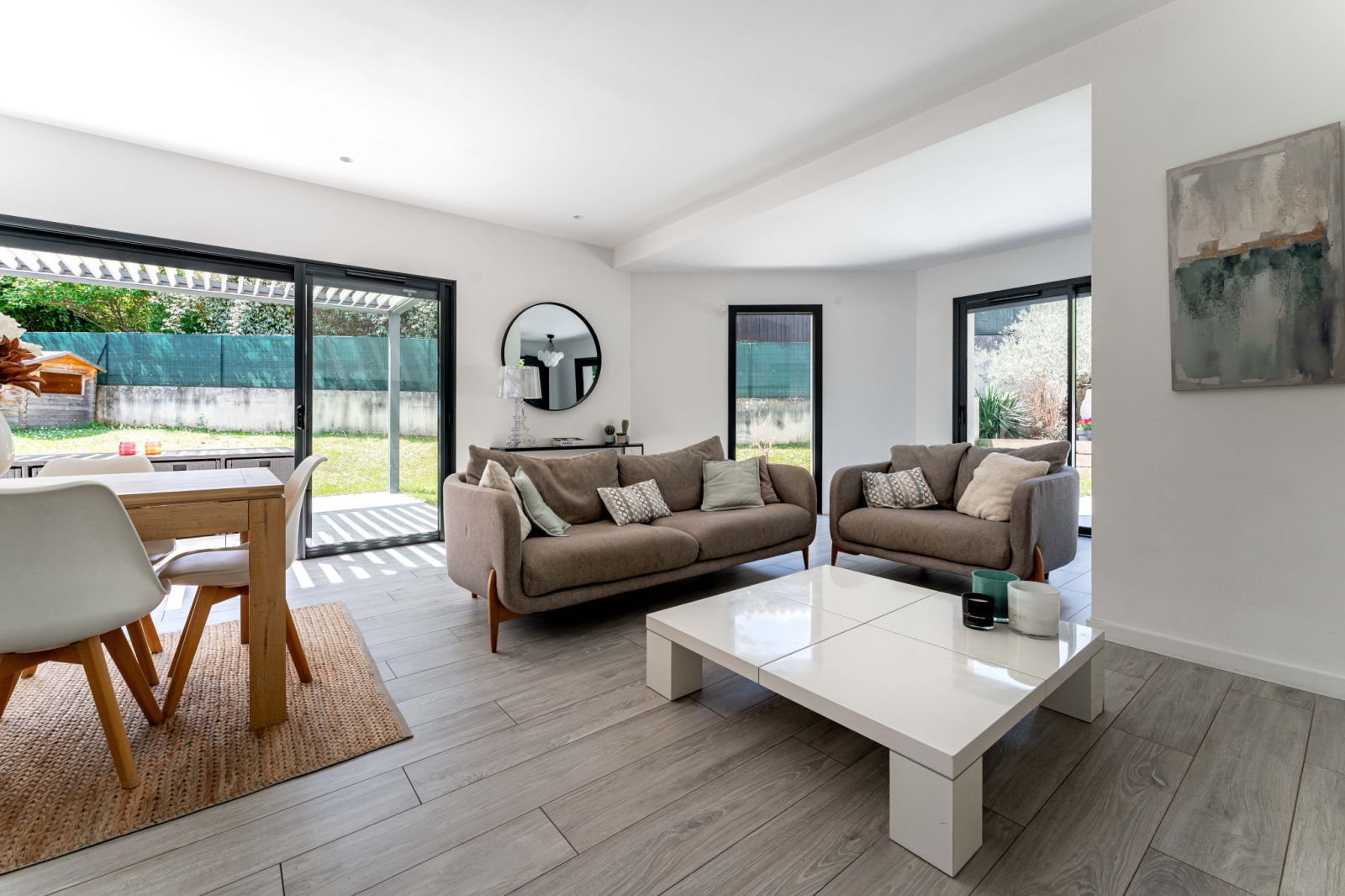 Elle se compose au rez-de-chaussée d'une entrée avec placard, une grande pièce de vie très lumineuse salon-salle à manger avec accès direct sur le jardin, une cuisine ouverte toute équipée, une suite parentale avec une salle d'eau et un dressing, un WC indépendant et une buanderie.