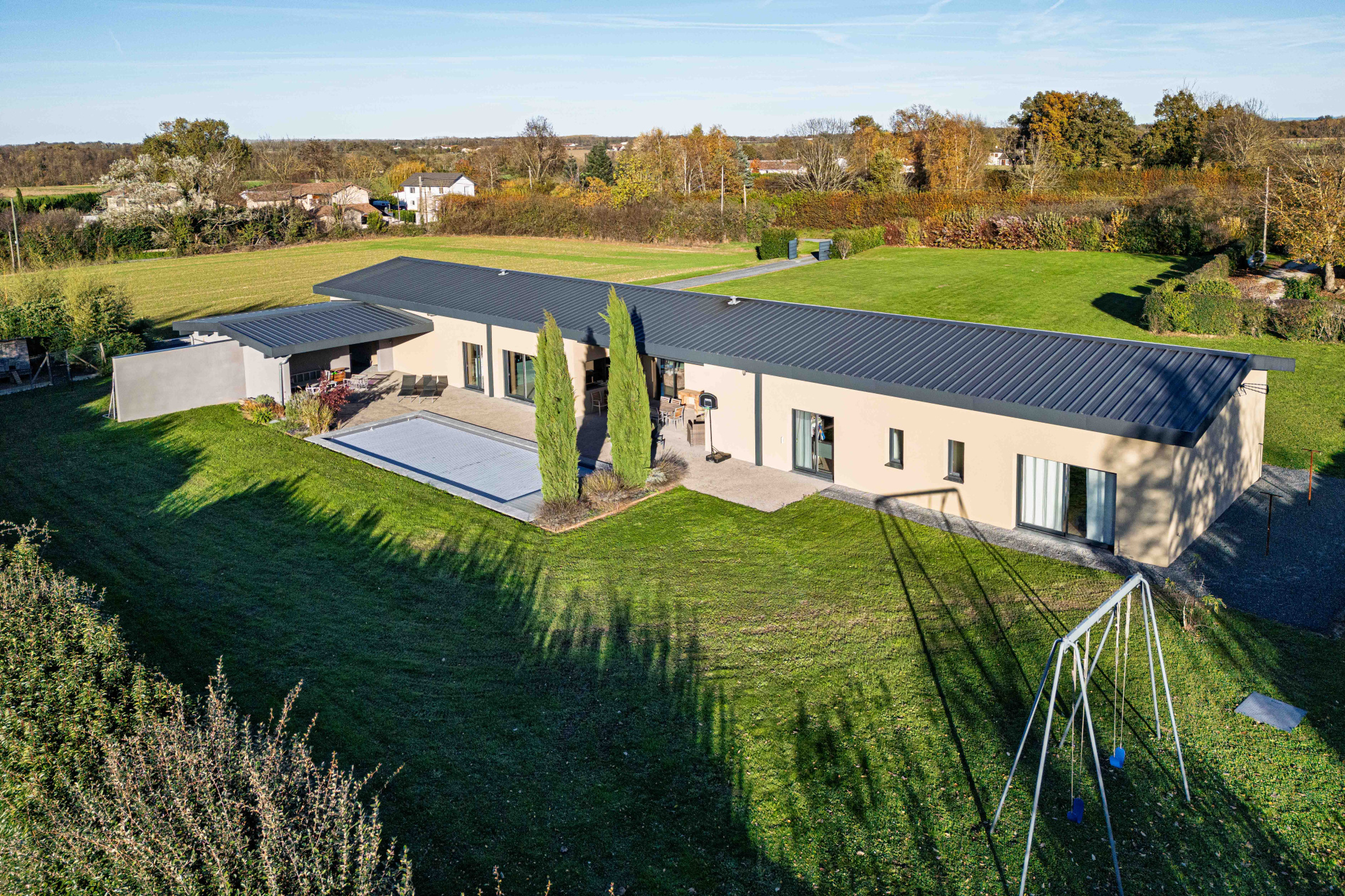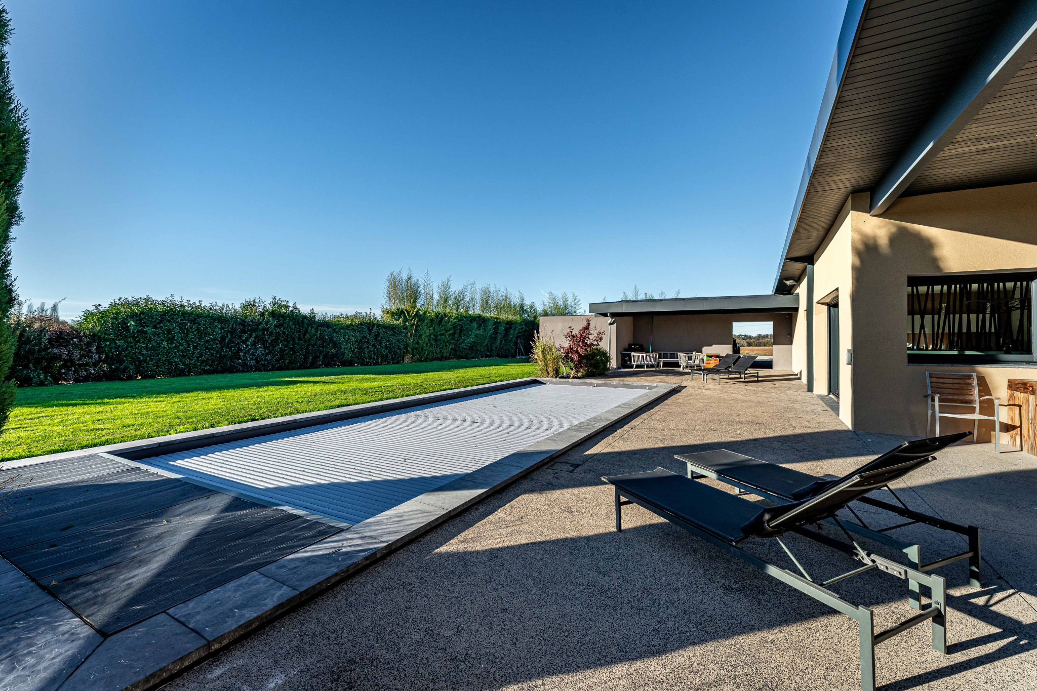 A l'extérieur, tout appelle à la détente : une piscine au sel chauffée ( 12X4 liner gris ) bordée de terrasses, deux espaces repas pour savourer le soleil du midi au soir, et un carport de 35m2 parfaitement intégré.